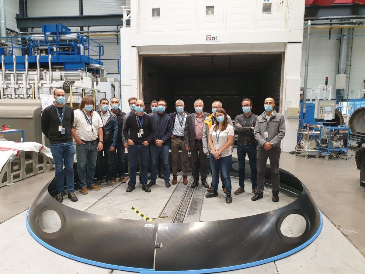 De g. à dr. : fabrication chez Daher du démonstrateur de cadre d’entrée d’air entièrement en thermoplastique de l’UltraFan ; les équipes Airbus et Daher réunies dans le premier démonstrateur
