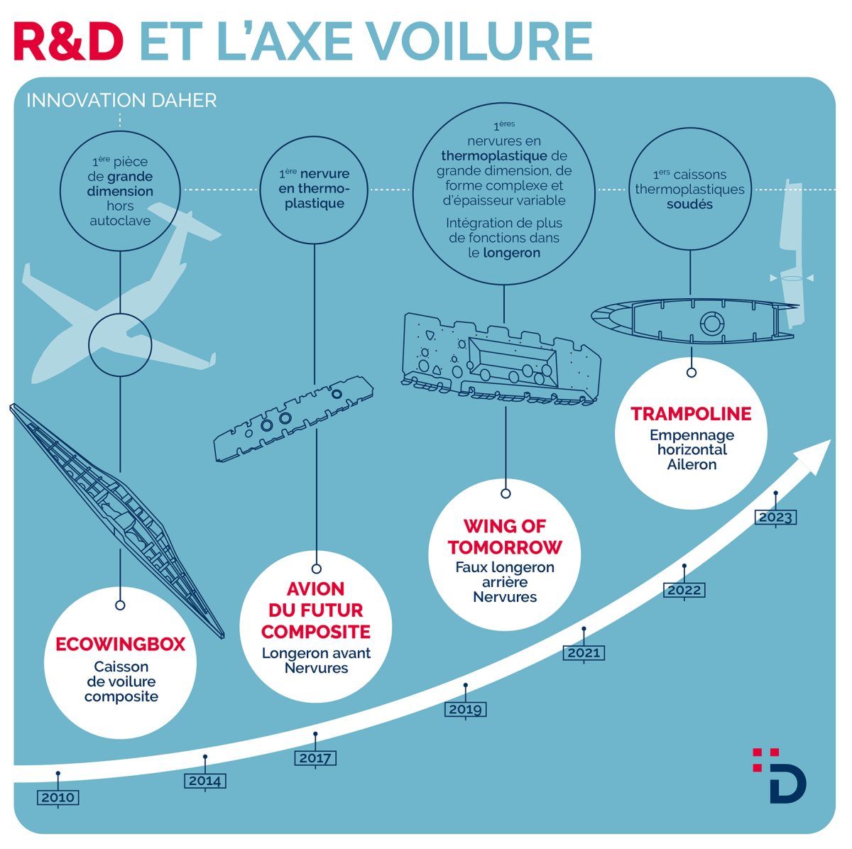 Améliorer l’aérodynamisme et l’éco-efficience globale des avions commerciaux, c’est l’objectif du programme « Wing of tomorrow » d’Airbus visant à développer la prochaine génération d’aile pour avion monocouloir (New Single Aisle). Les enjeux sont multiples : réduction des délais de mise sur le marché, réduction des coûts, performances, réduction de la masse, cadences de production… En confiant à Daher, dans le cadre de ce projet majeur en termes de recherche et développement, la conception et de la réalisation d’un faux longeron en composite thermodurcissable et de cinq nervures thermoplastiques fortement chargées, Airbus entendait bénéficier d’une expertise unique développée au fil des ans grâce à un enchainement méthodique de projets de R&D.